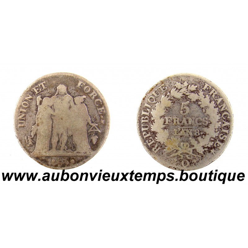 5 FRANCS Argent 900 ‰ AN 8 Q UNION et FORCE - UNION SERREE - GLAND INT. BAS et EXT. DIM : 37 mm Poids : 24.20 g Cotation B+ Gadoury 2025 563a : 85€ J.M. 2010 545.58 : 177€ LE FRANC 2023 288.149 : 52€