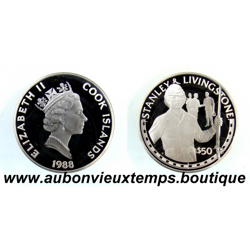 50 DOLLARS Argent 925‰ BE 1988 ELIZABETH II - ILES COOK - STANLEY & LIVINGSTONE - Les GRANDS EXPLORATEURS DIM : 38 mm Poids : 19.25 g FDC Cotation KM 61 : 64€ Cours au 17.12.2025 : 33.20€ Avers : ELIZABETH II COOK ISLANDS / RDM / 1988. Description : Effigie de la reine Elizabeth II tournée vers la droite, date en bas. Revers : STANLEY & LIVINGSTONE / $50 / FM. ( The Franklin Mint ), Wawa, Pennsylvanie, États-Unis ( 1964-2003 )