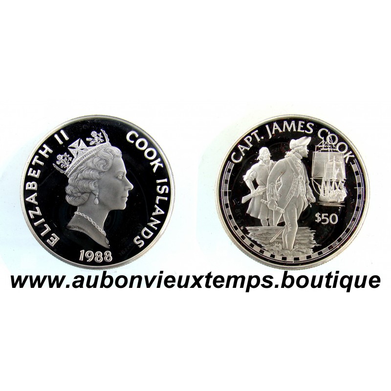 50 DOLLARS Argent 925‰ BE 1988 ELIZABETH II - ILES COOK - CAPT. JAMES COOK - Les GRANDS EXPLORATEURS DIM : 38 mm Poids : 19.25 g FDC Cotation KM 62 : 97€ Cours au 17.12.2025 : 33.20€ Avers : ELIZABETH II COOK ISLANDS / RDM / 1988. Description : Effigie de la reine Elizabeth II tournée vers la droite, date en bas. Revers : CAPT. JAMES COOK / $50 / FM. ( The Franklin Mint ), Wawa, Pennsylvanie, États-Unis ( 1964-2003 )