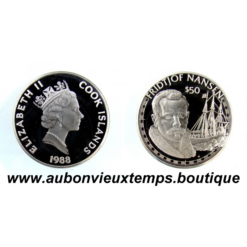 50 DOLLARS Argent 925‰ BE 1988 ELIZABETH II - ILES COOK - FRIDTJOF NANSEN - Les GRANDS EXPLORATEURS DIM : 38 mm Poids : 19.25 g FDC Cotation KM 108 : 70€ Cours au 17.12.2025 : 33.20€ Avers : ELIZABETH II COOK ISLANDS / RDM / 1988. Description : Effigie de la reine Elizabeth II tournée vers la droite, date en bas. Revers : FRIDTJOF NANSEN / $50 / FM. ( The Franklin Mint ), Wawa, Pennsylvanie, États-Unis ( 1964-2003 )