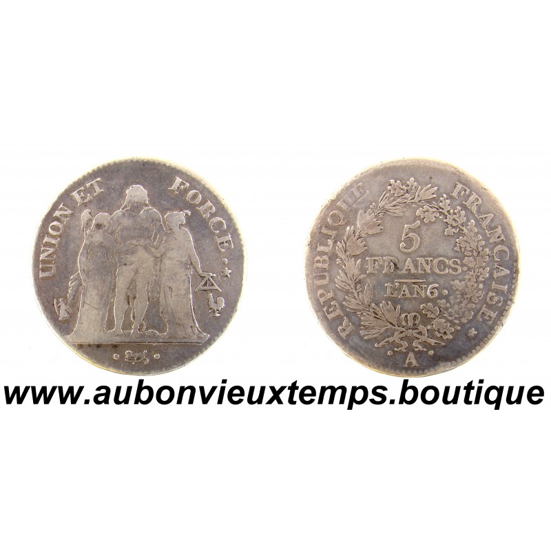 5 FRANCS Argent 900 ‰ AN 6 A ( 6 sur 5 ) UNION et FORCE - UNION SERREE - GLAND INT. BAS et EXT. DIM : 37 mm Poids : 24.50 g Cotation TB Gadoury 2025 563 : 120€ J.M. 2010 545.20 : LE FRANC 2023 288. : 90€