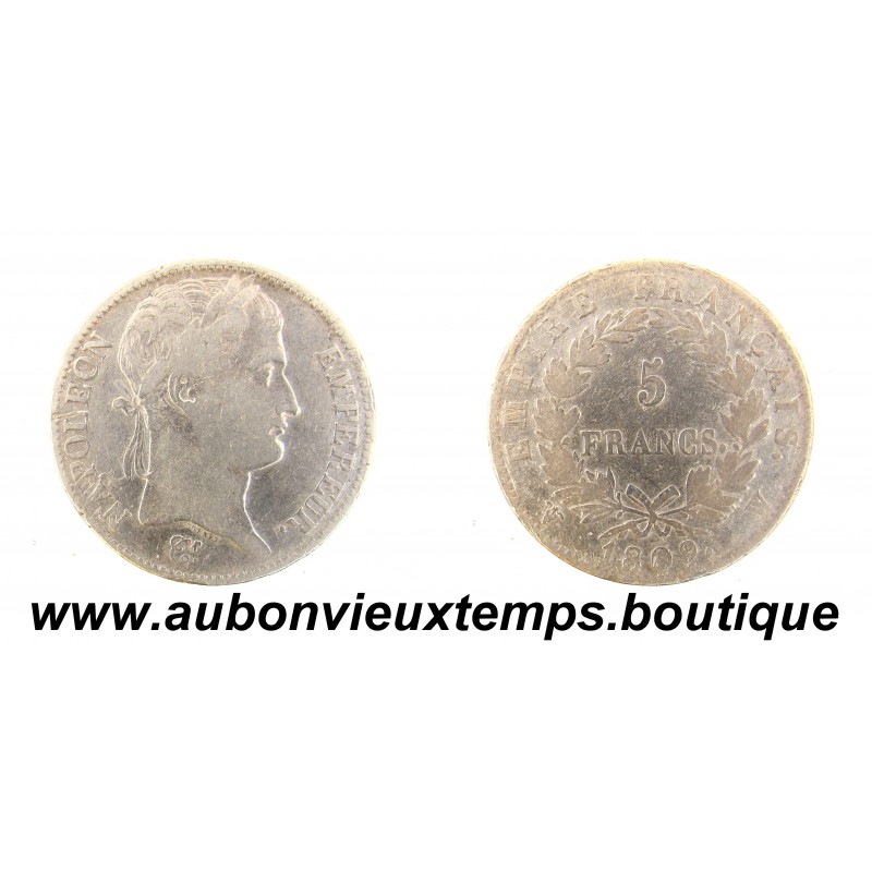 5 FRANCS Argent 900 ‰ 1809 W NAPOLEON 1er - TETE LAUREE DIM : 37 mm Poids : 24.60 g Cotation TB+ Gadoury 2025 584 : 155€ J.M. 2010 594.13 : 103€ LE FRANC 2023 307.13 : 120€