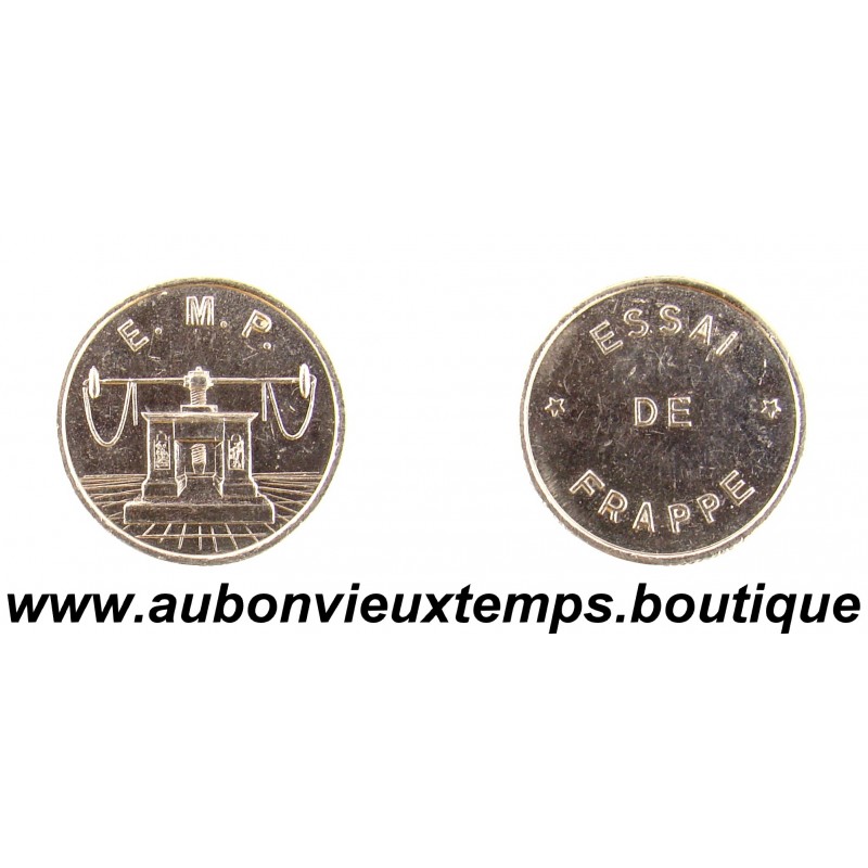 ESSAI 10 FRANCS ND ( 1986 ) E.M.P. avec 5 séries de stries RARE R1 POIDS : 6.50 g DIM : 21 mm Cotation SUP : J.M. 2011 1586 :150€ Avers : E.M.P. Description : Balancier. Revers : ESSAI / DE / FRAPPE. Description : En trois lignes dans le champ, entre deux étoiles à 5 rais.