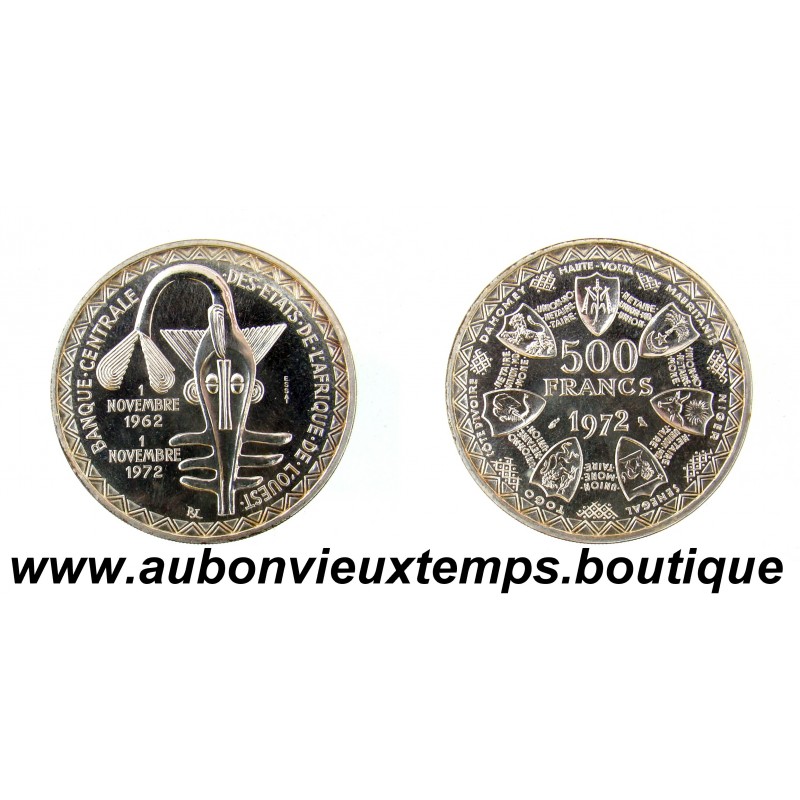 ESSAI 500 FRANCS Argent 900 ‰ 1972 BANQUE CENTRALE des ETATS de l'AFRIQUE de l'OUEST RARE R1 2000 ex POIDS : 25.00 g DIM : 37 mm Avers : BANQUE . CENTRALE . DES . ÉTATS . DE . L’AFRIQUE . DE . L’OUEST. / ESSAI / 1 / NOVEMBRE/1962 / 1 / NOVEMBRE /1972. Description : Logo de la BCEAO. Revers : HAUTE - VOLTA / MAURITANIE / NIGER / SENEGAL / TOGO / COTE D’IVOIRE / DAHOMEY / ( Autour d’un collier de blason lié par la légende répétée ) : UNION MONÉTAIRE OUEST-AFRICAINE / 500 / FRANCS / 1972. Description : Collier de blasons.