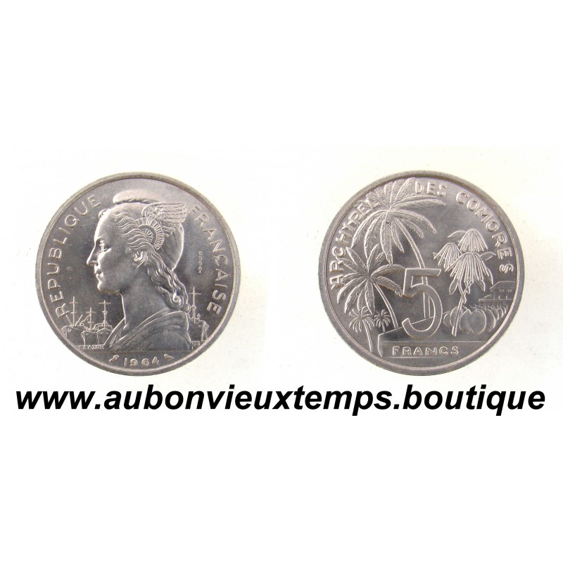 ESSAI 5 FRANCS Aluminium 1964 ARCHIPEL des COMORES RARE 1700 ex DIM : 31 mm POIDS : 3.75 g Avers : REPUBLIQUE FRANÇAISE / ESSAI / 1964. Description : Marianne au casque ailé à gauche et navires. Revers : ARCHIPEL DES COMORES / 5 / FRANCS. Description : Palmiers et plantation.