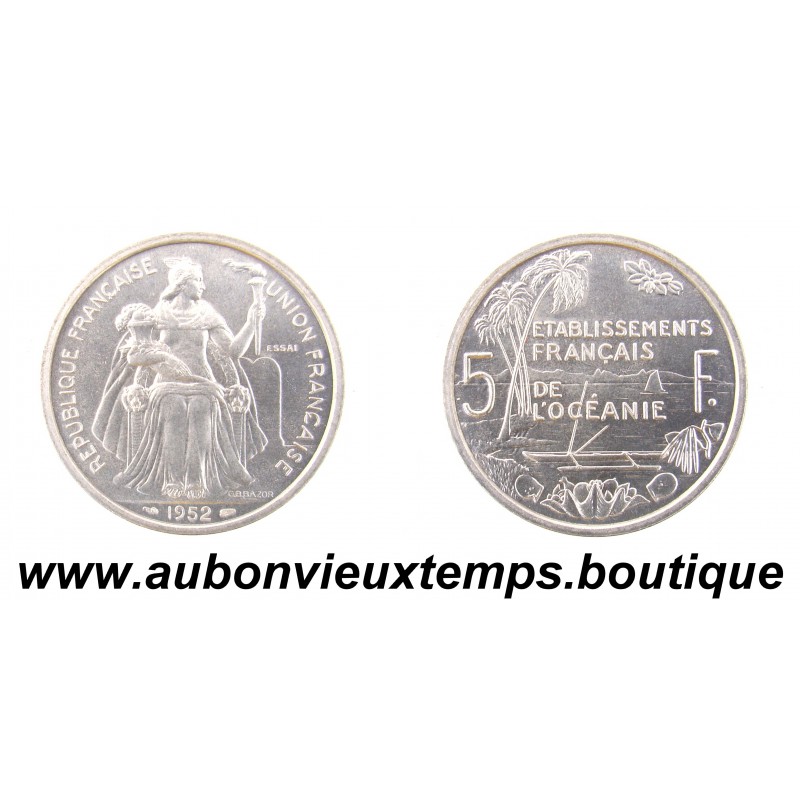 ESSAI 5 FRANCS Aluminium 1952 ETABLISSEMENTS FRANCAIS de l'OCEANIE RARE R2 1200 ex DIM : 31 mm POIDS : 3.85 g Avers : REPUBLIQUE FRANÇAISE - UNION FRANÇAISE / 1952 / ESSAI. Description : Représentation allégorique de Minerve assise. Revers : ETABLISSEMENTS / FRANÇAIS / DE / L’OCÉANIE / 5 - F. Description : Paysage polynésien avec cocotiers, voilier et pirogue à balancier.