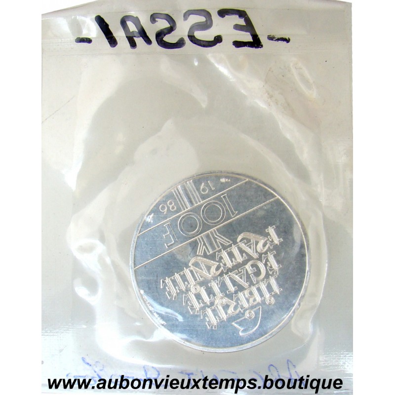 ESSAI 100 FRANCS Argent 900 ‰ 1986 LIBERTE RARE 1850 ex sous BLISTER DIM : 31 mm Poids : 15.00 g Cotation FDC Gadoury 2025 901 : 90€ J.M. 2010 1695.9 : 65€ LE FRANC 2023 454.1 : 85€ Avers : ESSAI / 1886 / 1986 / RÉPUBLIQUE / FRANÇAISE. Description : Statue de la Liberté vue de face entourée d'un vol d'oiseaux. Revers : LIBERTÉ / ÉGALITÉ / FRATERNITÉ / 100 F / 1986. Description : Bonnet phrygien surmontant la devise de la France.