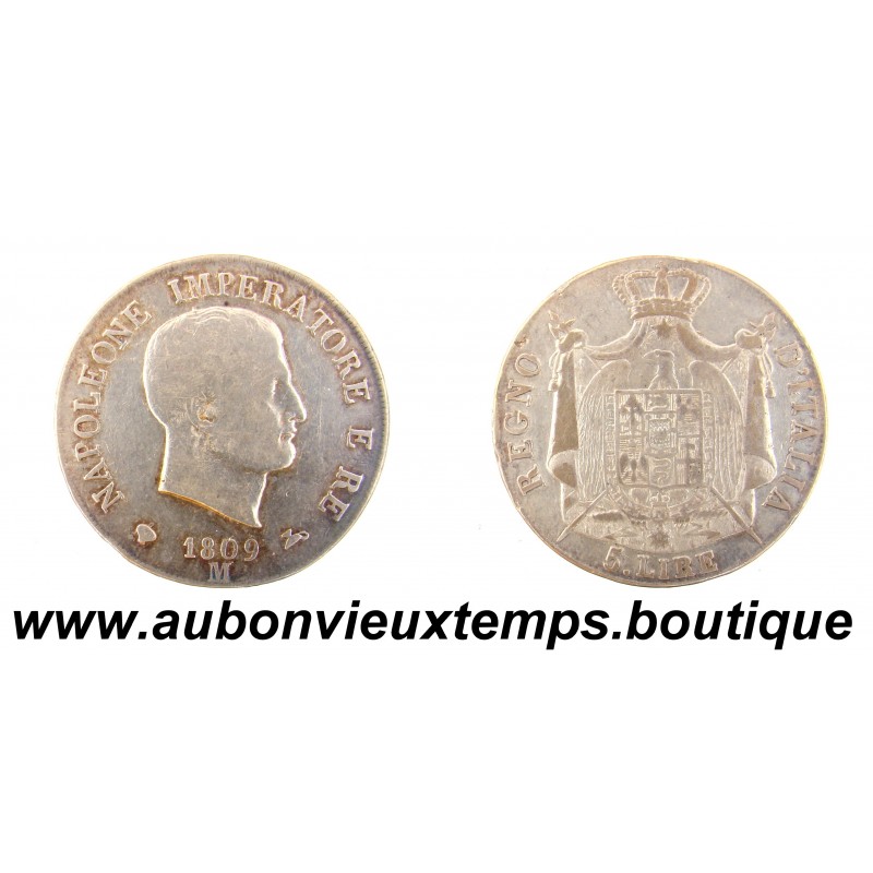 5 LIRE Argent 900 ‰ 1809 M NAPOLEONE IMPERATORE E RE - 1er Type DIM : 37 mm Poids : 24.45 g Cotation TB Gadoury 2025 IT27 : 60€ Cours au 9.04.2026 : 48.50€