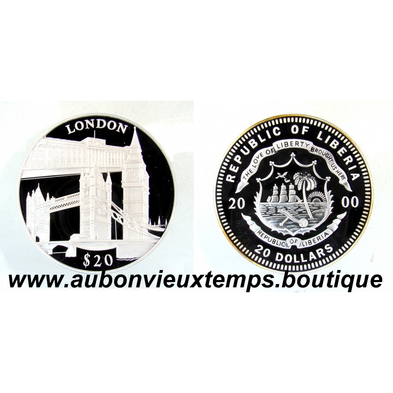 20 DOLLARS Argent 999‰ 2000 LONDON - MONUMENTS EUROPEENS - LIBERIA RARE POIDS : 20 g DIM : 40 mm Cours au 15.01.2026 : 52.15€ Avers : REPUBLIC OF LIBERIA / THE LOVE OF LIBERTY BROUGHT US HERE / 2000 / REPUBLIC OF LIBERIA / 20 DOLLARS. Description : Armoiries divisant la date, légende au dessus, dénomination en dessous. Revers : LONDON / $20. Description : Monuments de Londres, légende au dessus, dénomination en dessous.