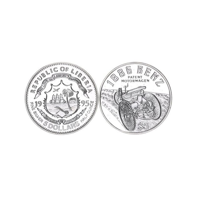 5 DOLLARS Argent 999‰ BE ( 1/2 ONCE ) 1995 BENZ 1886 - PATENT MOTORWAGEN - LIBERIA RARE POIDS : 15.5 g DIM : 32 mm Cotation World Coins FDC : 89€ Cours au 15.01.2026 : 40.40€ Avers : REPUBLIC OF LIBERIA / THE LOVE OF LIBERTY BROUGHT US HERE / 19 95 / 5 DOLLARS / FINE SILVER HALF ONCE. Description : Armoiries. Revers : 1886 BENZ / PATENT MOTORWAGEN / $5. Description : Tricycle.