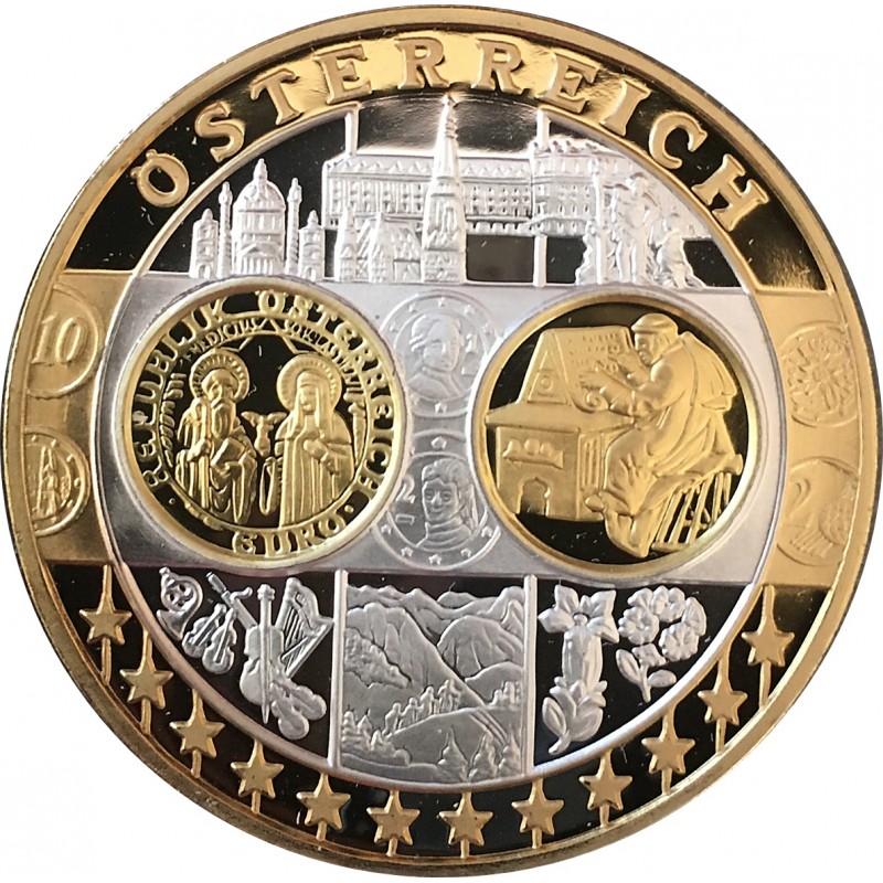 MONNAIE LINGOT - OSTERREICH POIDS : 20 g DIM : 39 mm Avers : OSTERREICH. Description : Les différents monuments et personnages important symboles d’Autriche. Revers : Cartographie des pays européens. EUROPE ** EUROPA *** Argent 999‰ Plaqué Or 999‰ Cours au 2.11.2025 : 28.15€