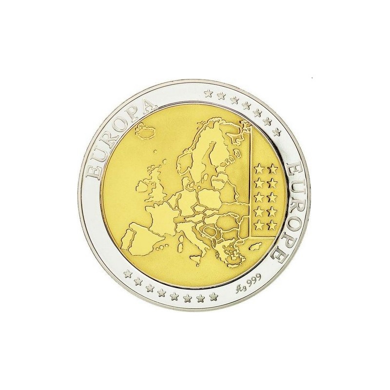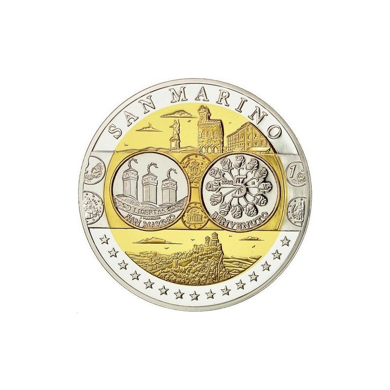 MONNAIE LINGOT - SAN MARINO POIDS : 20 g DIM : 39 mm Avers : SAN MARINO. Description : Les différents monuments et personnages important symboles de Saint Marin. Revers : Cartographie des pays européens. EUROPE ** EUROPA *** Argent 999‰ Plaqué Or 999‰