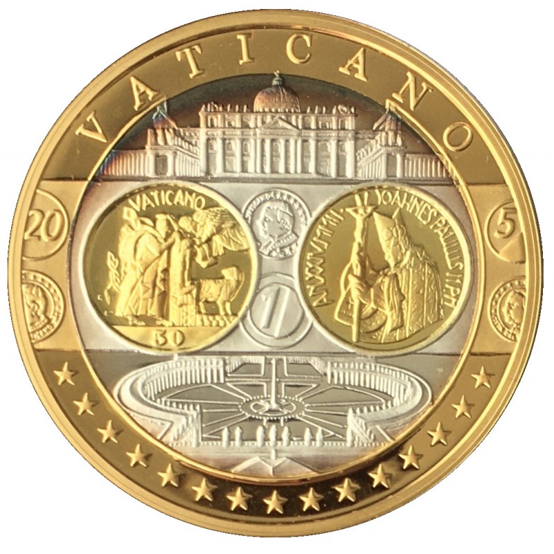 MONNAIE LINGOT - CITTA DEL VATICANO POIDS : 20 g DIM : 39 mm Avers : CITTA DEL VATICANO. Description : Les différents monuments et personnages important symboles de la Cité du Vatican. Revers : Cartographie des pays européens. EUROPE ** EUROPA *** Argent 999‰ Plaqué Or 999‰ Cours au 2.11.2025 : 28.15€