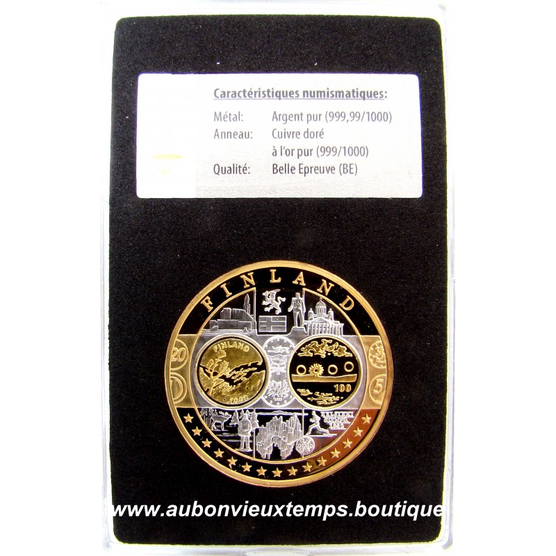 Avers : FINLAND. Description : Les différents monuments et personnages important symboles de la Finlande. Revers : Cartographie des pays européens. EUROPE ** EUROPA *** Argent 999‰ Plaqué Or 999‰ Cours au 12.12.2025 : 29€ Nota : fissure sur la face arrière du boitier