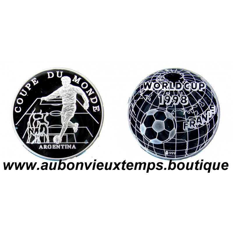 MEDAILLE MONETIFORME Argent 999‰ COUPE du MONDE 1998 FOOTBALL - FRANCE - EQUIPE d'ARGENTINE RARE 7777 ex EDITIONS M. GODE DIM : 40 mm Poids : 21.55 g FDC Cours au 17.12.2025 : 40.20€ avec CERTIFICAT d'AUTHENTICITE