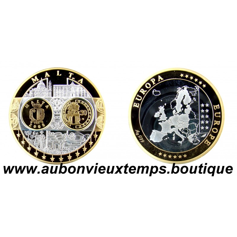 MONNAIE LINGOT - MALTA POIDS : 20.07 g DIM : 39 mm Avers : MALTA. Description : Les différents monuments et personnages important symboles de Malte. Revers : Cartographie des pays européens. EUROPE ** EUROPA *** Argent 999‰ Plaqué Or 999‰ Cours au 22.12.2025 : 39€