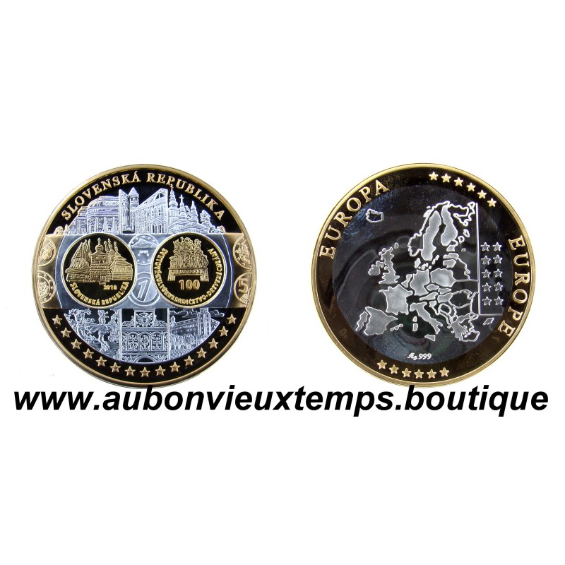 MONNAIE LINGOT - SLOVENSKA REPUBLIKA POIDS : 20.07 g DIM : 39 mm Avers : SLOVENSKA REPUBLIKA. Description : Les différents monuments et personnages important symboles de la Slovaquie. Revers : Cartographie des pays européens. EUROPE ** EUROPA *** Argent 999‰ Plaqué Or 999‰ Cours au 22.12.2025 : 39€