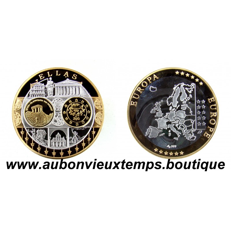 MONNAIE LINGOT - ELLAS POIDS : 20.07 g DIM : 39 mm Avers : ELLAS. Description : Les différents monuments et personnages important symboles de Malte. Revers : Cartographie des pays européens. EUROPE ** EUROPA *** Argent 999‰ Plaqué Or 999‰ Cours au 22.12.2025 : 39€