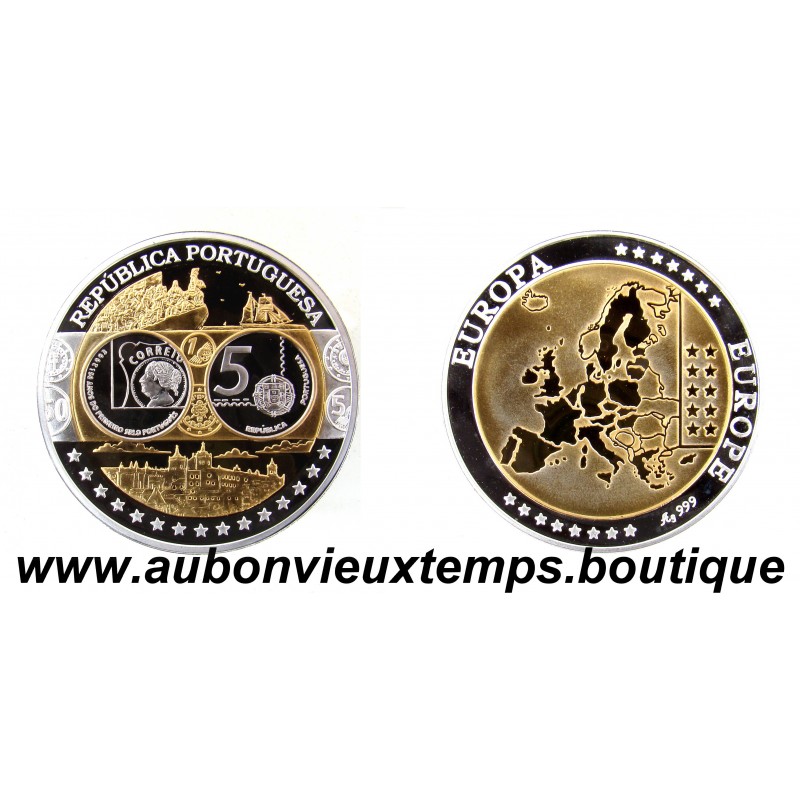 MONNAIE LINGOT - REPUBLICA PORTUGUESA POIDS : 20.13 g DIM : 39 mm Avers : REPUBLICA PORTUGUESA. Description : Les différents monuments et personnages important symboles du Portugal. Revers : Cartographie des pays européens. EUROPE ** EUROPA *** Argent 999‰ Plaqué Or 999‰ Cours au 22.12.2025 : 39€