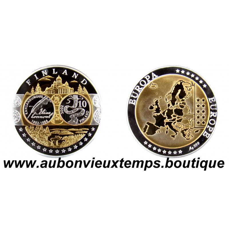 MONNAIE LINGOT - FINLAND POIDS : 20.13 g DIM : 39 mm Avers : FINLAND. Description : Les différents monuments et personnages important symboles de la Finlande. Revers : Cartographie des pays européens. EUROPE ** EUROPA *** Argent 999‰ Plaqué Or 999‰ Cours au 22.12.2025 : 39€