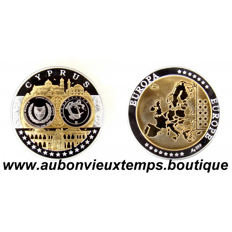 MONNAIE LINGOT - CYPRUS POIDS : 20.13 g DIM : 39 mm Avers : CYPRUS. Description : Les différents monuments et personnages important symboles de Chypre. Revers : Cartographie des pays européens. EUROPE ** EUROPA *** Argent 999‰ Plaqué Or 999‰ Cours au 22.12.2025 : 39€
