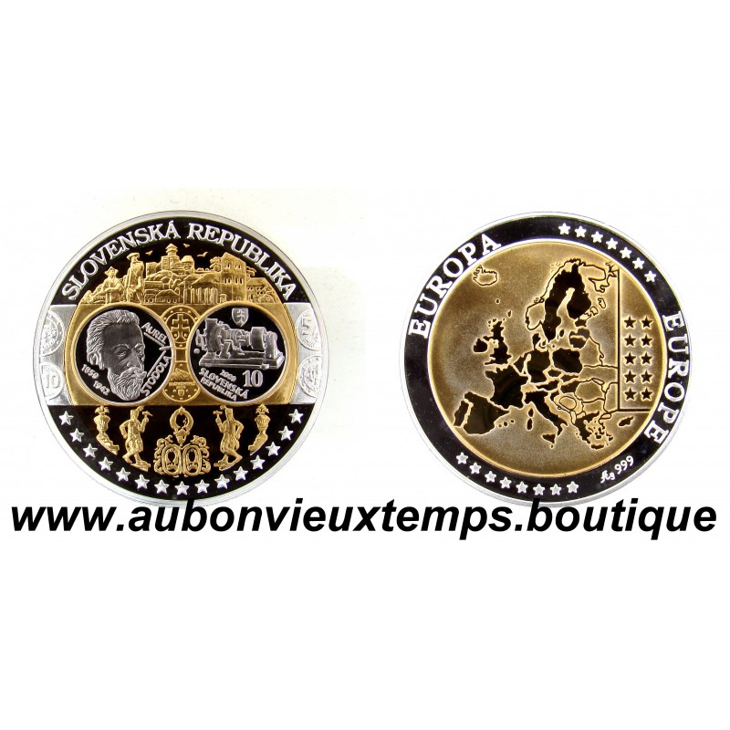 MONNAIE LINGOT - SLOVENSKA REPUBLIKA POIDS : 20.13 g DIM : 39 mm Avers : SLOVENSKA REPUBLIKA. Description : Les différents monuments et personnages important symboles de la Slovaquie. Revers : Cartographie des pays européens. EUROPE ** EUROPA *** Argent 999‰ Plaqué Or 999‰ Cours au 22.12.2025 : 39€