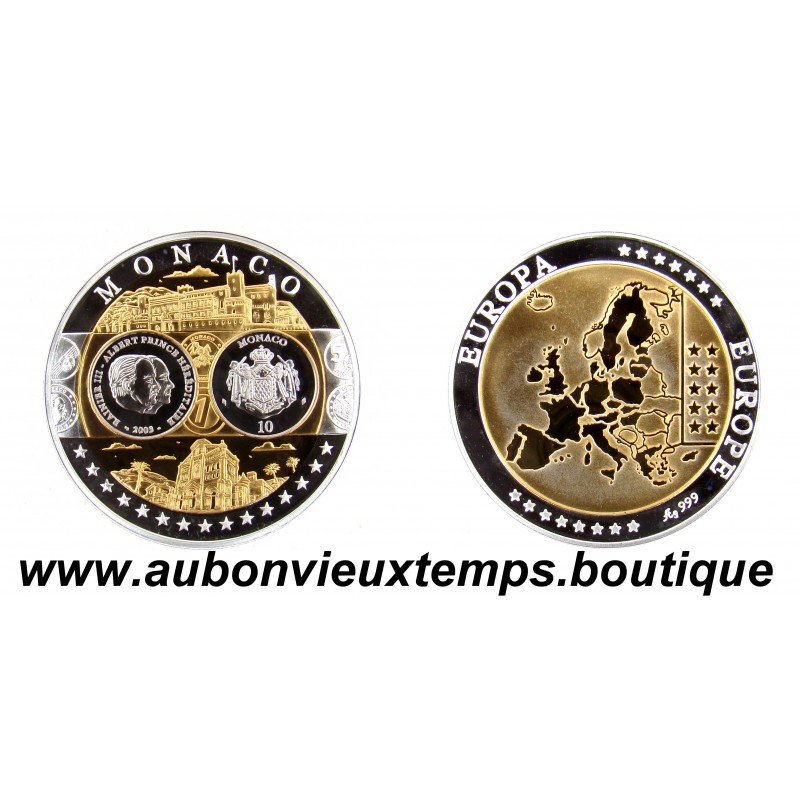 MONNAIE LINGOT - MONACO POIDS : 20.13 g DIM : 39 mm Avers : MONACO. Description : Les différents monuments et personnages important symboles de Monaco. Revers : Cartographie des pays européens. EUROPE ** EUROPA *** Argent 999‰ Plaqué Or 999‰ Cours au 22.12.2025 : 39€