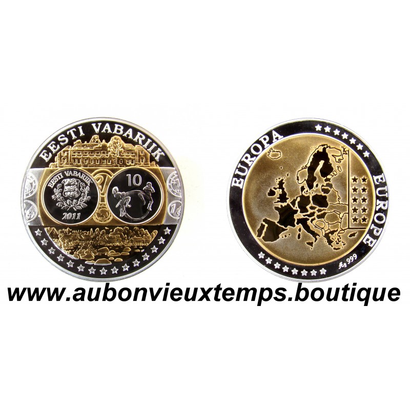 MONNAIE LINGOT - EESTI VABARIIK POIDS : 20.13 g DIM : 39 mm Avers : EESTI VABARIIK. Description : Les différents monuments et personnages important symboles de l'Estonie. Revers : Cartographie des pays européens. EUROPE ** EUROPA *** Argent 999‰ Plaqué Or 999‰ Cours au 22.12.2025 : 39€