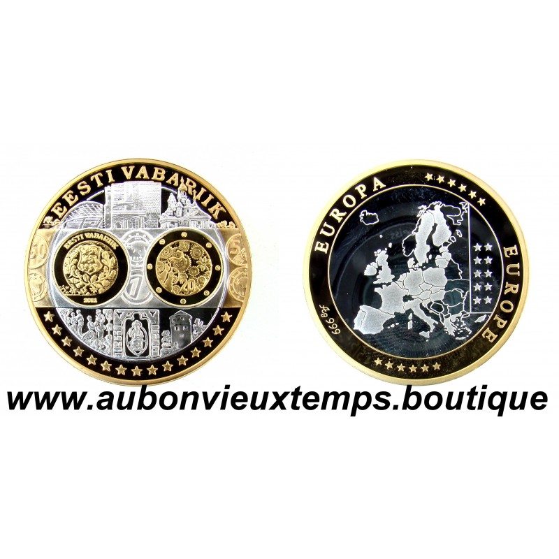 MONNAIE LINGOT - EESTI VABARIIK POIDS : 20.13 g DIM : 39 mm Avers : EESTI VABARIIK. Description : Les différents monuments et personnages important symboles de l'Estonie.. Revers : Cartographie des pays européens. EUROPE ** EUROPA *** Argent 999‰ Plaqué Or 999‰ Cours au 06.01.2026 : 46.75€