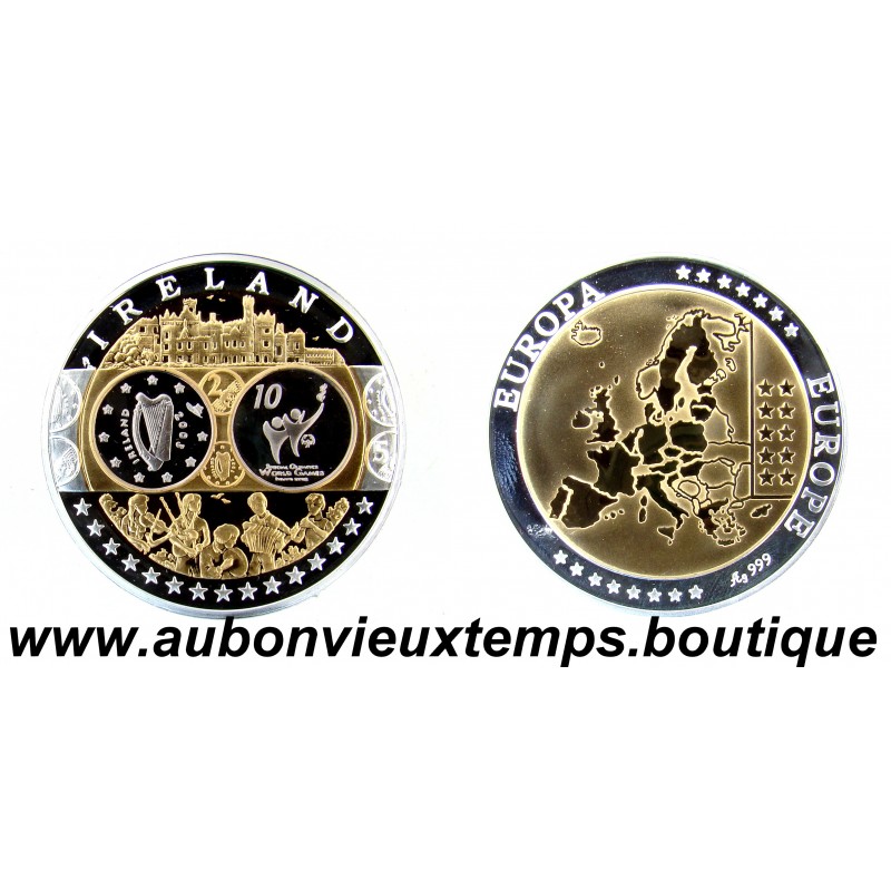 MONNAIE LINGOT - IRELAND POIDS : 20.13 g DIM : 39 mm Avers : IRELAND. Description : Les différents monuments et personnages important symboles de l'Irelande. Revers : Cartographie des pays européens. EUROPE ** EUROPA *** Argent 999‰ Plaqué Or 999‰ Cours au 06.01.2026 : 46.75€