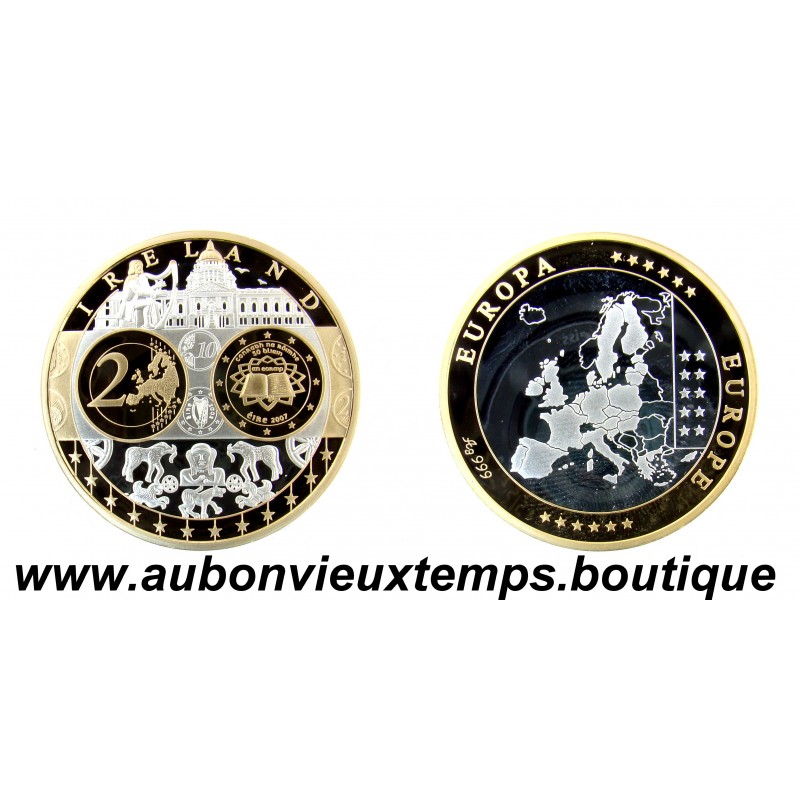 MONNAIE LINGOT - IRELAND POIDS : 18.15 g DIM : 39 mm Avers : IRELAND. Description : Les différents monuments et personnages important symboles de l'Irelande. Revers : Cartographie des pays européens. EUROPE ** EUROPA *** Argent 999‰ Plaqué Or 999‰ Cours au 06.01.2026 : 42.45€