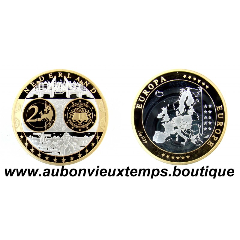 MONNAIE LINGOT - NEDERLAND POIDS : 18.15 g DIM : 39 mm Avers : NEDERLAND. Description : Les différents monuments et personnages important symboles de l'Hollande. Revers : Cartographie des pays européens. EUROPE ** EUROPA *** Argent 999‰ Plaqué Or 999‰ Cours au 06.01.2026 : 42.45€