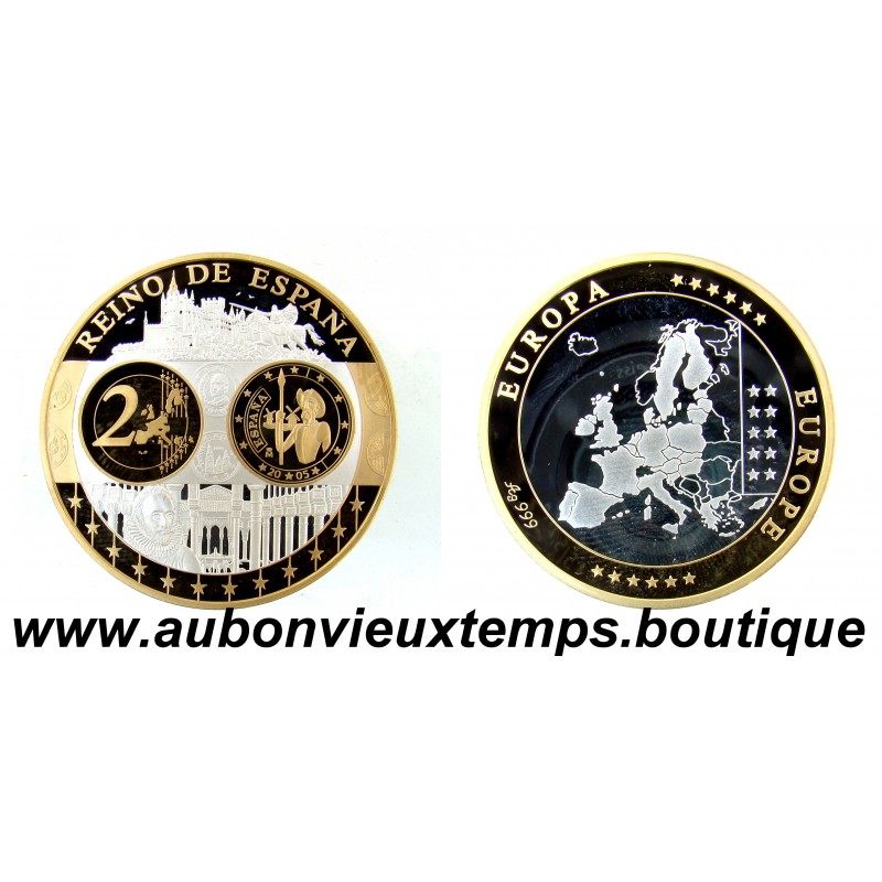 MONNAIE LINGOT - REINO de ESPANA POIDS : 18.15 g DIM : 39 mm Avers : REINO de ESPANA. Description : Les différents monuments et personnages important symboles de l'Espagne. Revers : Cartographie des pays européens. EUROPE ** EUROPA *** Argent 999‰ Plaqué Or 999‰ Cours au 06.01.2026 : 42.45€