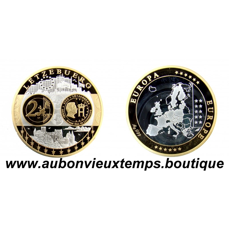 MONNAIE LINGOT - LETZEBUERG POIDS : 18.15 g DIM : 39 mm Avers : LETZEBUERG. Description : Les différents monuments et personnages important symboles du Luxembourg. Revers : Cartographie des pays européens. EUROPE ** EUROPA *** Argent 999‰ Plaqué Or 999‰ Cours au 06.01.2026 : 42.45€