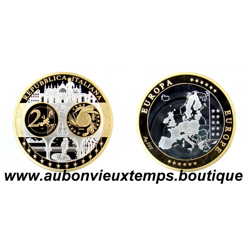 MONNAIE LINGOT - REPUBBLICA ITALIANA POIDS : 18.15 g DIM : 39 mm Avers : REPUBBLICA ITALIANA. Description : Les différents monuments et personnages important symboles de l'Italie. Revers : Cartographie des pays européens. EUROPE ** EUROPA *** Argent 999‰ Plaqué Or 999‰ Cours au 06.01.2026 : 42.45€