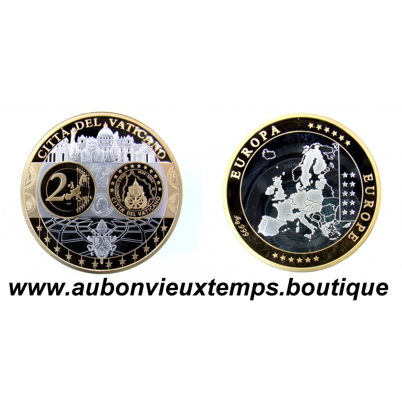 MONNAIE LINGOT - CITTA DEL VATICANO POIDS : 18.15 g DIM : 39 mm Avers : CITTA DEL VATICANO. Description : Les différents monuments et personnages important symboles du Vatican. Revers : Cartographie des pays européens. EUROPE ** EUROPA *** Argent 999‰ Plaqué Or 999‰ Cours au 06.01.2026 : 42.45€