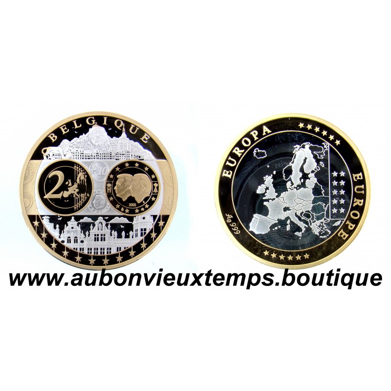 MONNAIE LINGOT - BELGIQUE POIDS : 18.15 g DIM : 39 mm Avers : BELGIQUE. Description : Les différents monuments et personnages important symboles de la Belgique. Revers : Cartographie des pays européens. EUROPE ** EUROPA *** Argent 999‰ Plaqué Or 999‰ Cours au 06.01.2026 : 42.45€