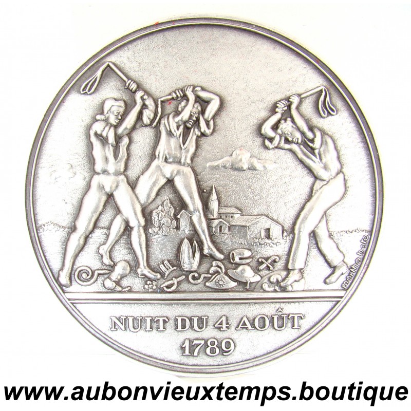 MEDAILLE Bronze plaquée Argent 1988 NUIT du 4 AOUT 1789 - BICENTENAIRE de la REVOLUTION FRANCAISE RARE 9690 ex DIM : 77 mm POIDS : 240 g Avers : NUIT DU 4 AOÛT / 1789. Description : Paysans qui battent des chapeaux et des attributs du clergé, une église à l’arrière plan. Revers : BICENTENAIRE / DE LA / RÉVOLUTION / FRANÇAISE. Description : Légende en 4 lignes horizontales. Tranche : lisse + corne BR + 1989.