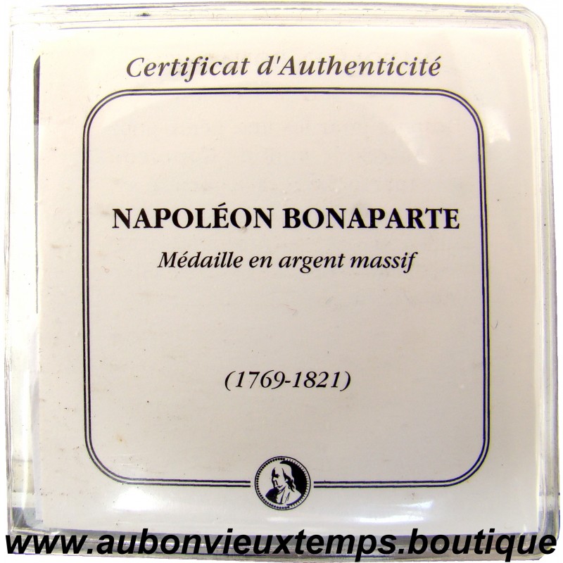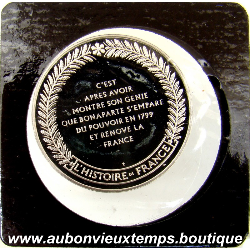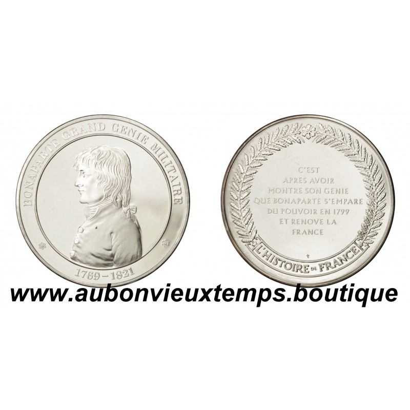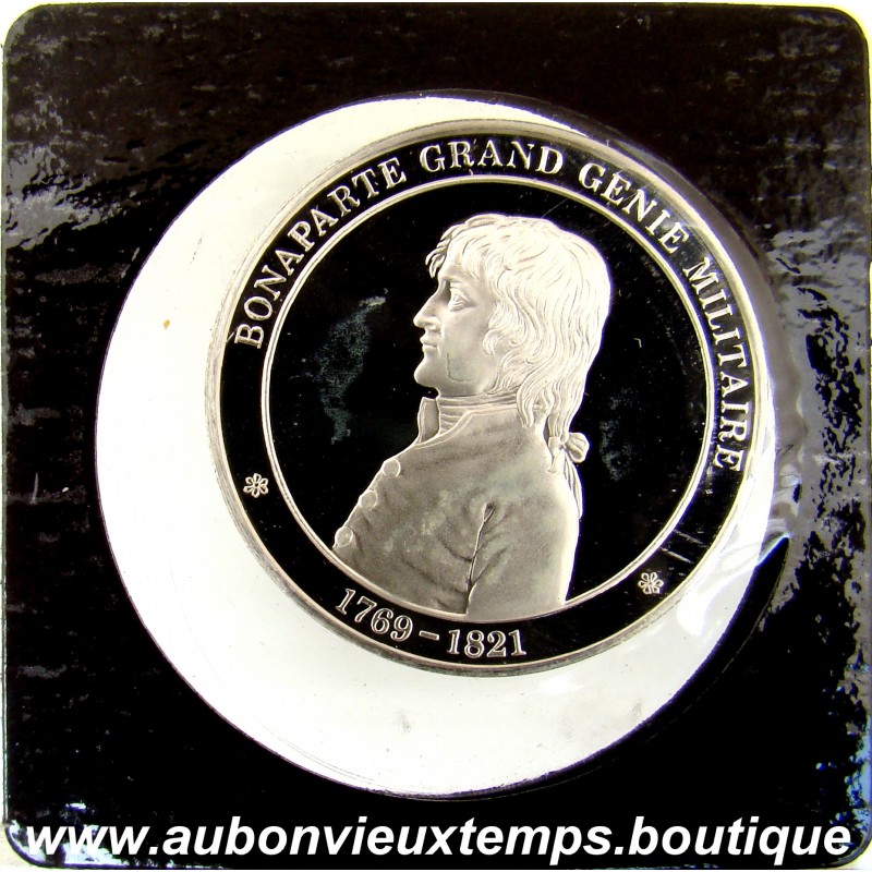 MEDAILLE Argent 999 ‰ BE ND ( 1978 ) BONAPARTE GRAND GENIE MILITAIRE du MEDAILLER FRANKLIN DIM : 34 mm POIDS : 16.90 g et 24.50 g avec la pochette Cours au 12.03.2026 : 42.00€ Avers : BONAPARTE GRAND GENIE MILITAIRE - 1769-1821. Description : Buste de profil de Napoléon Bonaparte à gauche. Revers : C’EST / APRES AVOIR / MONTRE SON GENIE / QUE BONAPARTE S’EMPARE / DU POUVOIR EN 1799 / ET RENOVE LA / FRANCE / L’HISTOIRE DE FRANCE. Description : Légende en 7 lignes plus en cartouche à l’exergue de la couronne végétale.