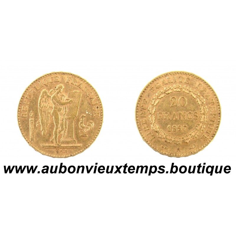 20 FRANCS OR 900 ‰ 1897 A GENIE DIM : 21 mm Poids : 6.45 g Cours au 10.03.2026 : 854.00€/U Nota : IMPORTANT, cet article ne pourra être vendu qu’avec un paiement par PAYPAL ou VIREMENT BANCAIRE, et un envoi UNIQUEMENT par Mondial Relay, sauf pays non desservis, sinon les COMMANDES seront REFUSEES. Note: important, this item can only be sold with a payment by PayPal