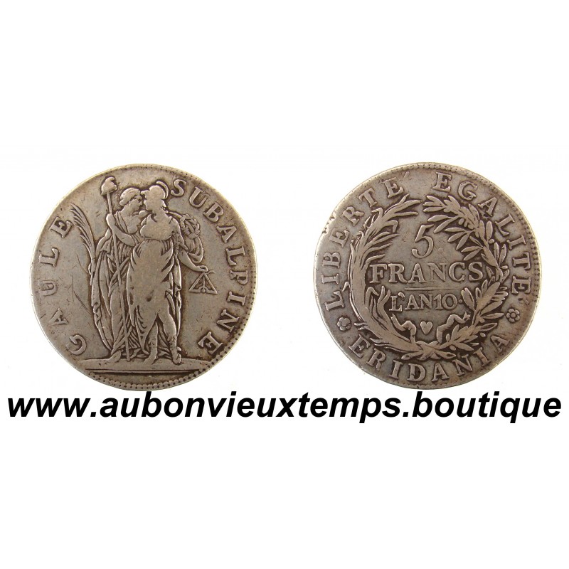 5 FRANCS Argent 900 ‰ AN 10 GAULE SUBALPINE - TURIN - REPUBLIQUE du PIEMONT RARE R1 141194 ex DIM : 37 mm POIDS : 24.70 g