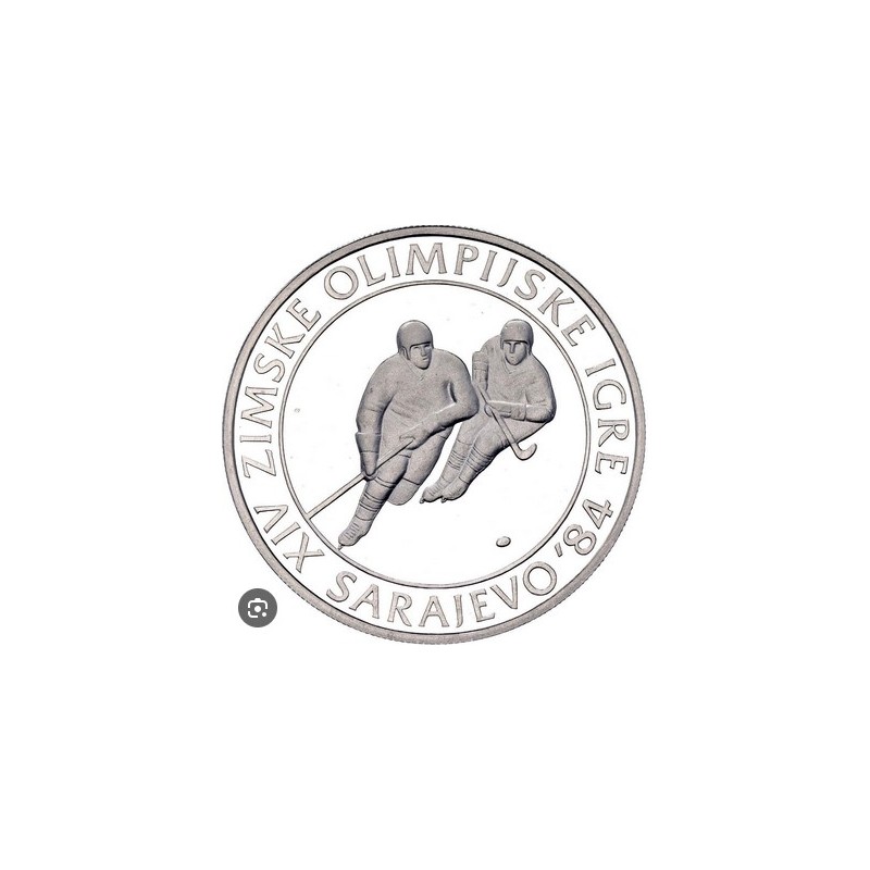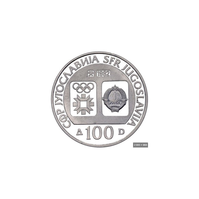 100 DINARA Argent 925‰ BE 1984 J.O. SARAJEVO - YOUGOSLAVIE 110 000 ex POIDS : 13 g DIM : 30 mm Avers : XIV ZIMSKE OLIMPIJSKE IGRE / SARAJEVO '84. Description : Joueurs de hockey. Revers : СФР ЈУГОСЛАВИЈА SFR JUGOSLAVIJA / 1984 / 29·XI·1943 / Д 500 D. ( ДИHAPA 500 DINARA ). Légende complète : Социјалистичка Федеративна Република Југославија / Socijalistička Federativna Republika Jugoslavija. Description : Logo olympique avec le logo officiel des Jeux olympiques d'hiver de Sarajevo en bas dans l'écu de gauche et les armoiries de la RSFY dans l'écu de droite, le tout dans un cercle plat en bas.
