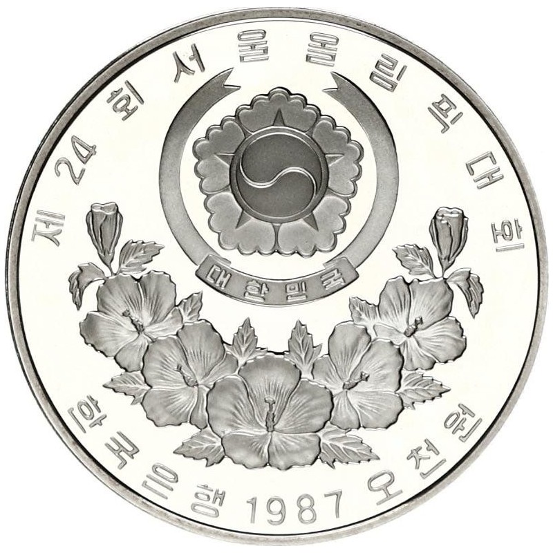 5000 WON Argent 925‰ BE 1987 J.O. SEOUL - COREE du SUD POIDS : 16.8 g DIM : 32 mm Avers : 제 24회서울올림픽대회 / 한국은행 1987 오천원. Description : Armoiries nationales en haut, gerbe de fleurs en bas. Revers : XXIV OLYMPIAD SEOUL 1988 / 5000 WON. Description : Concours "Girls on swing.
