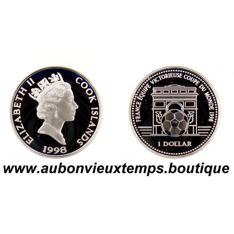 DOLLAR Argent 500‰ BE 1998 COUPE du MONDE - ILES COOK RARE 10 000 ex POIDS : 10 g DIM : 30 mm Avers : ELIZABETH II COOK ISLANDS / RDM / 1998. Description : Buste à droite d’Elizabeth II. Revers : FRANCE ÉQUIPE VICTORIEUSE COUPE DU MONDE 1998 / 1 DOLLAR. Description : Ballon de football, Arc de Triomphe en arrière plan.