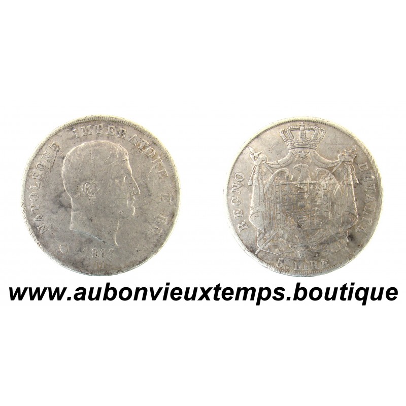 5 LIRE Argent 900 ‰ 1811 M - NAPOLEON 1er - REGNE d'ITALIE DIM : 37 mm POIDS : 24.60 g Cours au 4.02.2026 : 56.20€ Avers : NAPOLEONE IMPERATORE E RE / 1811 / M. Description : Tête nue à droite. Traduction : ( Napoléon empereur et roi ). Revers : REGNO - D'ITALIA / 5. LIRE. Description : Écu écartelé à cinq quartiers : au 1 des États du Pape ( Émilie-Romagne ), au 2 de Milan, au 3 de Venise, au 4 de Ligurie, au 5 de Savoie-Sardaigne, posé sur le tout un écu d'Italie aux armes de la Couronne de Fer, entouré du collier de la Légion d'Honneur, soutenu par une aigle posée sur un foudre surmonté d'une étoile, le tout posé sur un manteau couronné, brochant deux hallebardes.