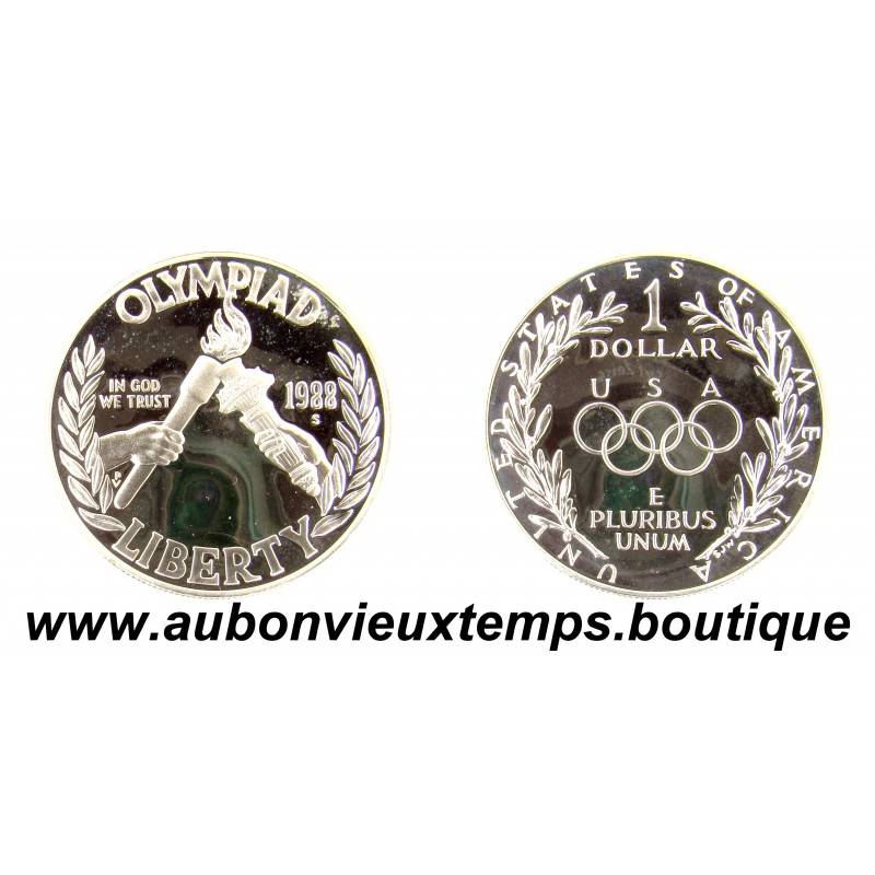DOLLAR Argent 900 ‰ BE 1988 S OLYMPIAD DIM : 38 mm POIDS : 26.80 g Cours au 4.02.2026 : 61.25€ Avers : OLYMPIAD / 1988 / LIBERTY. Description : Une main tient la torche de la Statue de la Liberté et l'autre la torche olympique. Les deux flammes se rejoignent et des branches d'olivier encadrent la scène. Revers : UNITED STATES OF AMERICA / 1 / DOLLAR / U S A. Description : Les anneaux olympiques apparaissent au centre, avec "USA" au-dessus et une autre paire de branches d'olivier encadrant la scène.