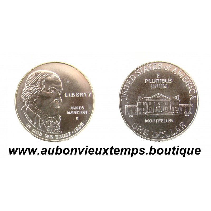 DOLLAR Argent 900 ‰ BU 1993 D JAMES MADISON DIM : 38 mm POIDS : 26.80 g Cours au 4.02.2026 : 61.25€ Avers : LIBERTY / JAMES MADISON / 1993. Description : Buste à droite de James Madison. Revers : UNITED STATES OF AMERICA / ONE DOLLAR / MONTPELIER. Description : Vue frontale de la demeure de Montpelier ( Virginie ), domaine de la famille Madison.