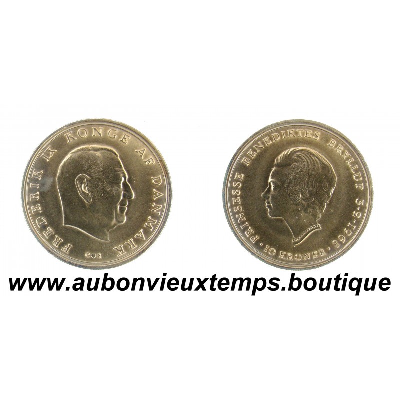 10 KRONER Argent 800‰ ND ( 1968 ) FREDERIK IX - MARIAGE de la PRINCESSE BENEDIKTES BRYLLUF - DANEMARK 253 837 ex DIM : 36 mm Poids : 20.50 g FDC Cotation World Coins KM.857 : 40€ Cours au 4.02.2026 : 40.60€ Avers : FREDERIK IX KONGE AF DANMARK / C♥S. Description : Portrait de profil droit de Frédéric IX. Revers : PRINSESSE BENEDIKTES BRYLLUP 3-2-1968 / .10 KRONER. Description : Portrait de profil gauche de la princesse Benedikte
