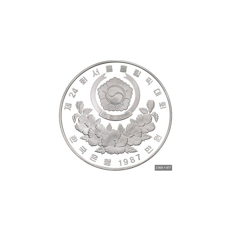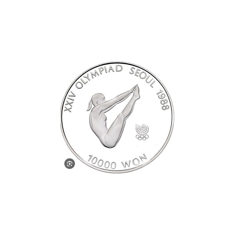 10 000 WON Argent 925‰ BE 1987 J.O. SEOUL - COREE du SUD POIDS : 33.6 g DIM : 40 mm Cours au 4.02.2026 : 78.90€ Avers : 제 24회서울올림픽대회 / 한국은행 1987 오천원. Description : Armoiries nationales en haut, gerbe de fleurs en bas. Revers : XXIV OLYMPIAD SEOUL 1988 / 5000 WON. Description : Plongeuse.