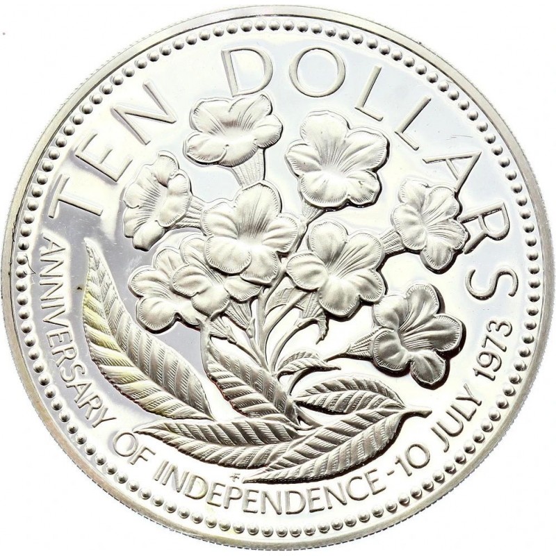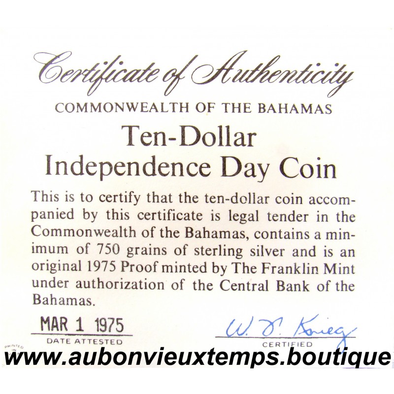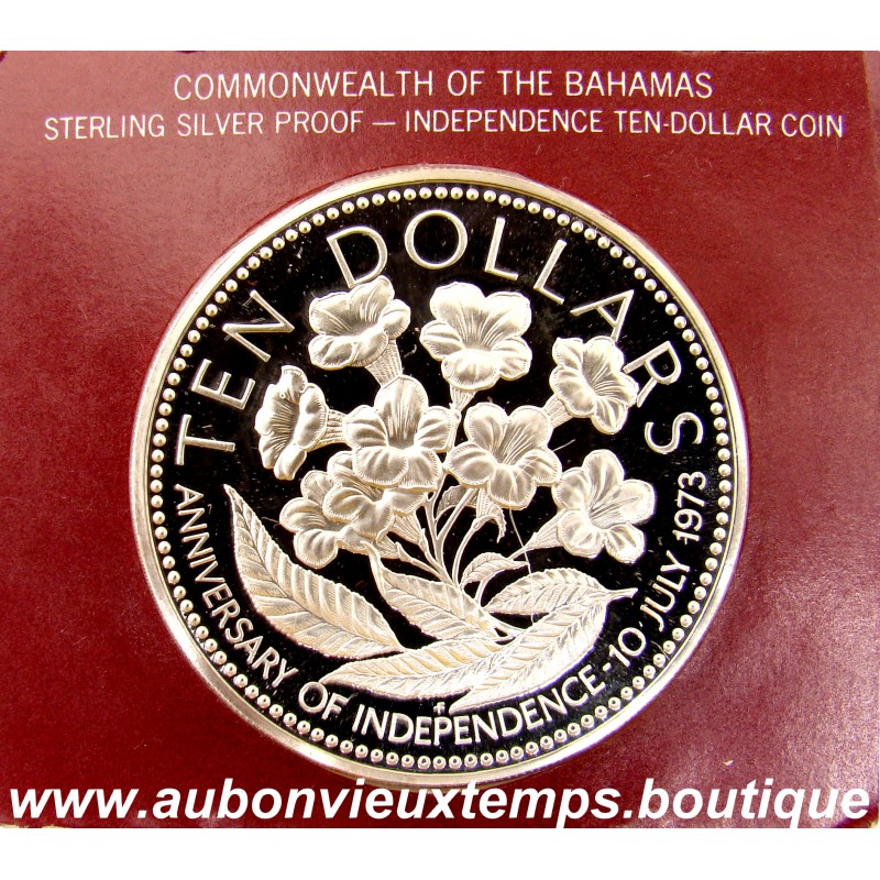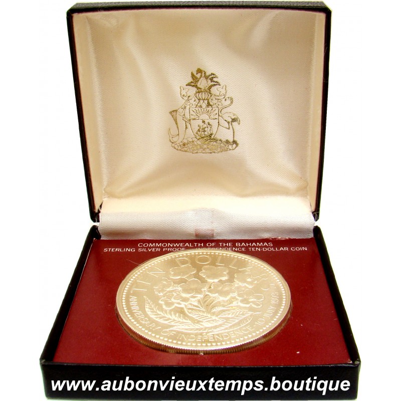 10 DOLLARS Argent 925 ‰ 1975 ANNIVERSAIRE de l'INDEPENDANCE - BAHAMAS RARE 63 000 ex DIM : 50 mm POIDS : 50.15 g et 129 g avec le coffret et le certificat Cours au 27.01.2026 : 144.50€ Avers : COMMONWEALTH OF THE BAHAMAS / 1975. Description : Armoiries, légende autour, date en dessous. Revers : TEN DOLLARS / ANNIVERSARY OF INDEPENDENCE / 10 JULY 1973. Description : Tecoma stans ( Trompette d’or ), légende autour. Nota : IMPORTANT, cet article ne pourra être vendu qu’avec un paiement par PAYPAL ou VIREMENT BANCAIRE, et un envoi UNIQUEMENT par Mondial Relay, sauf pays non desservis, sinon les COMMANDES seront REFUSEES. Note: important, this item can only be sold with a payment by PayPal
